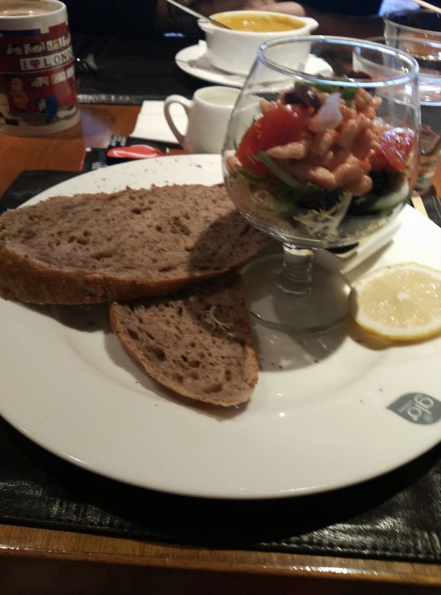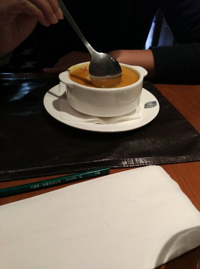 68元的团购套餐,前菜可以选南瓜汤和虾仁杯,我选了虾仁杯,杯底垫了些生菜,虾仁的味道拌得很不错的说,配了两片面包,可以夹黄油,或者蘸油醋,蛮好的说。朋友点了南瓜汤,就一碗汤,貌似看上去虾仁杯的性价比更高些。