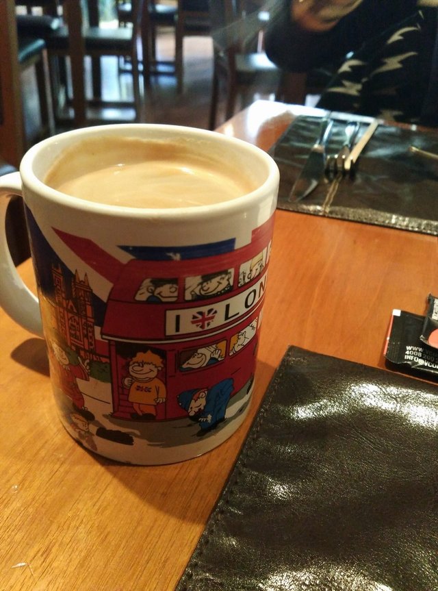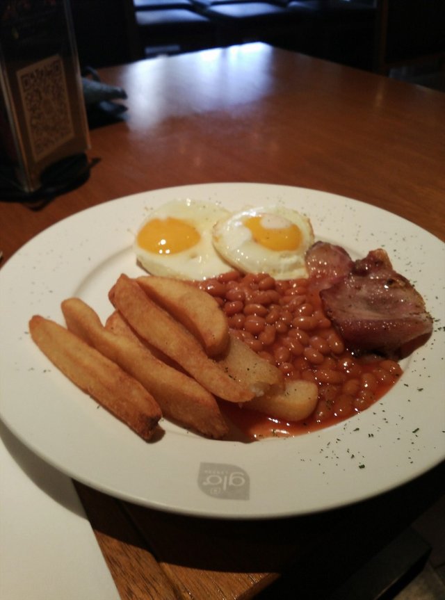 主菜我们都选了培根。里面有两片培根,两个单面煎的荷包蛋,豆子和薯条,一盘东西很管饱啊,培根煎得蛮香的,薯条外脆里酥。