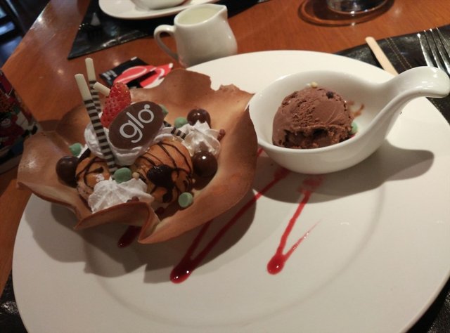 甜品我们都选了泡芙,造型很赞的说,三个小小的泡芙装在华夫碗里,满满的奶油啊,还配了一个巧克力冰淇淋球,巧克力味很浓郁。