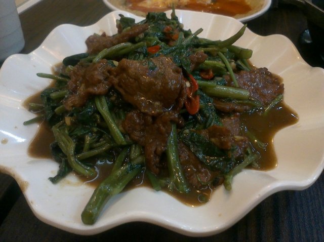 在千秋膳房我吃过类似的菜式,当时留下的印象不错,于是同样点了一道。菜面看起来有些乌慥慥的,估计都是沙茶的缘故吧。牛肉倒是很好的吸收了沙茶酱的味道。只是占据了一大盘子的空心菜,有些疲软的口感,少了些清脆。