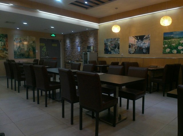 这家土鸡城在美食城的一头,占据的位置和空间,算是5楼各式食店中最大的了。不过大中午的辰光里,店里的客人寥寥无几,而那些排列整齐的桌椅,突显的店堂愈发的冷清了。四周的墙壁上,挂着以自然风景为主的油画,偶尔的几幅人物画,描绘着旧时人们生活劳动的场景,只是不知道反映的是不是台湾的景致。