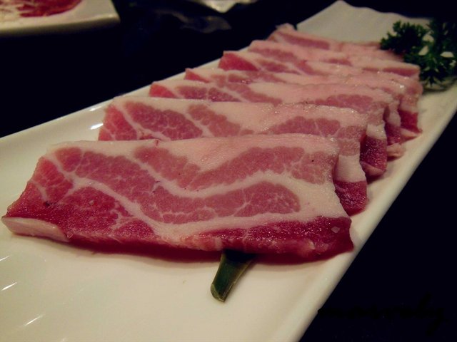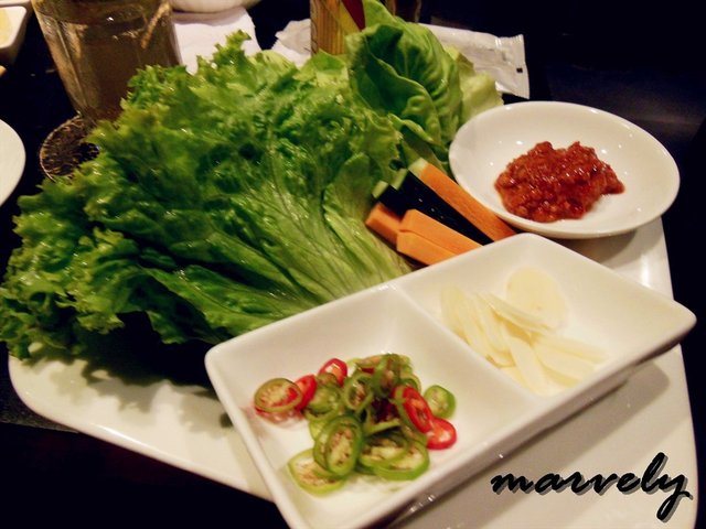 店家为怕油腻的客人提供了包肉的生菜,不过这一顿吃下来,我们基本没怎么觉得肉很油腻,也不怎么用到生菜。而为了不辜负这些生菜,我们其实还是点了一份猪五花。猪五花是需要烤一些时候的肉质,烤到肉色变焦黄,吱吱作响的时候就可以了。不过我们只用了一次生菜,又再度的辜负了它们,因为这些猪五花,烤完之后外焦里嫩的,不多的肥肉完全转变成了焦脆的油渣,吃起一点有负罪感都没有。
