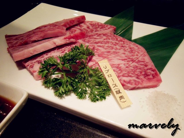 刚刚的眼肉深得我们的心意,于是重新单点了一份。眼肉是牛身上运动量最少的肉,据说它们是位于牛大腿部到臀部中间的位置。这份眼肉,质量要高级一些,肉身上布满了雪花状的脂肪纹路。这份眼肉,吃起来更加柔嫩,汁水也更加丰腴。大概是为了减轻有人会觉得有些肥厚的口感,店家用粗盐作为蘸酱,不过帮我们烤肉的店员技术很好,所以于我而言,这份眼肉丝毫没有肥腴的感觉,也完全不需要粗盐的佐伴。
