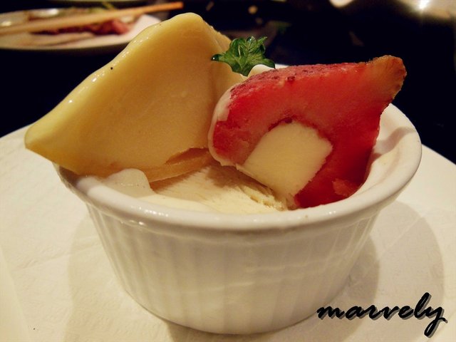 最后的最后,我们吃了冰激凌。每天的冰激凌是定例的,但绝对不是敷衍和简单的。我们的冰激凌,打底是一颗香草冰激凌,上面放着半颗草莓和一片芒果,他们绝对不是单纯的冰激凌,而是在急冻过的水果上,灌入相应口味的冰激凌,所以吃起来也很有意思的。