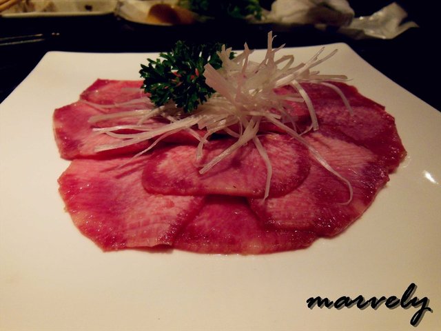 店里有一道比较特色的厚切特上牛舌是限量供应的,我们当然第一个就点它了。