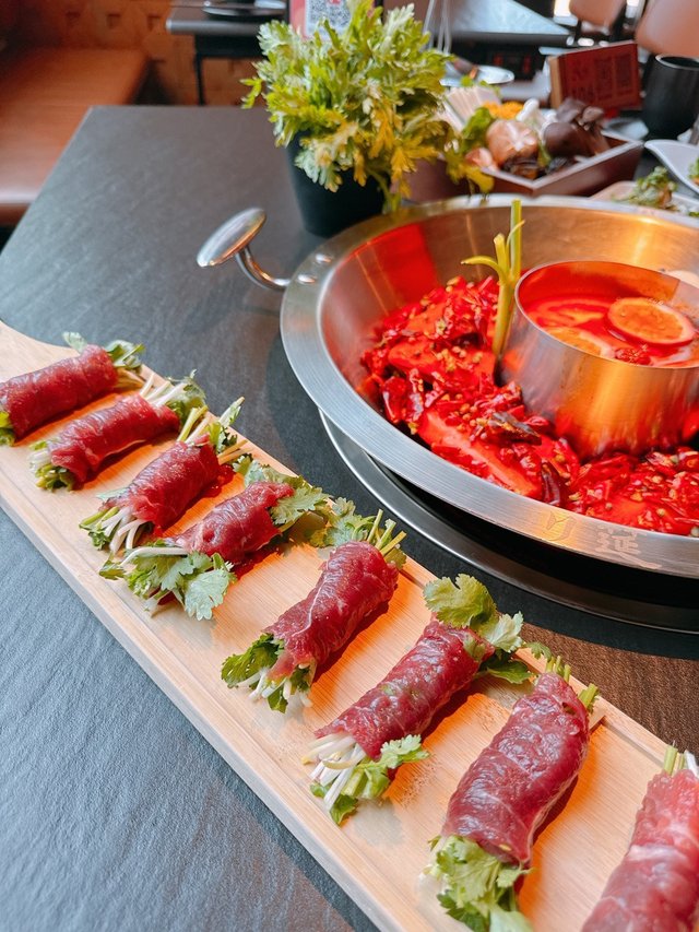 驚喜十足!牛肉包裹著豐富的香菜,香菜控一定會愛不釋手,建議配搭番茄鍋,讓口感更加清新!