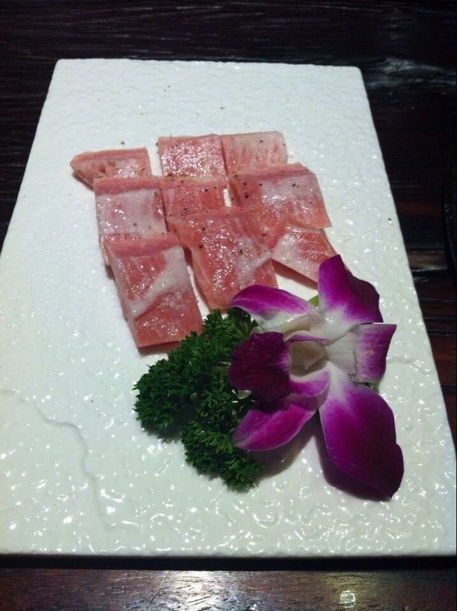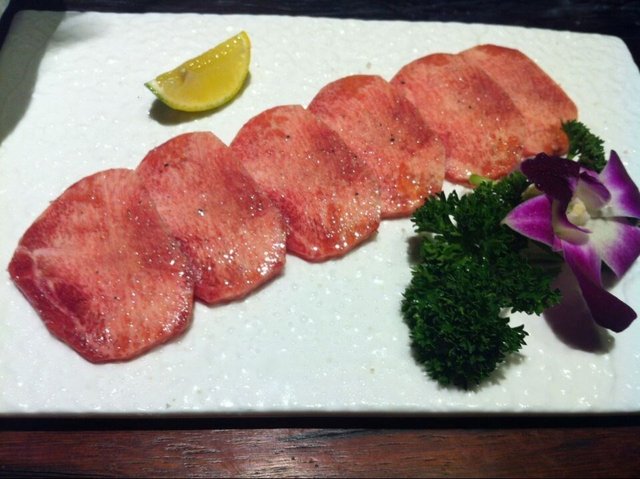 【薄切牛舌】虽说薄切牛舌,但是也蛮厚了,烤制的时间都是有讲究的,入口非常的鲜嫩,很有嚼劲弹性十足的口感,果然是上等品质的哟!