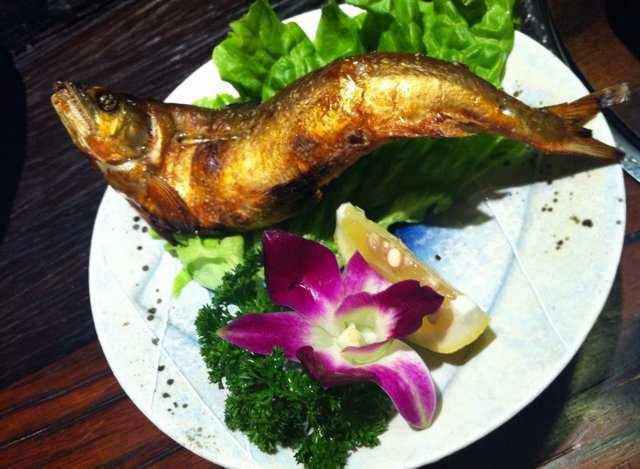 【烤香鱼】香鱼外皮烤制的非常脆,肉质超级紧实的,入口鲜美,琳上柠檬汁,酸酸的带有一些酸甜鲜美之味,还是很不错的哟!