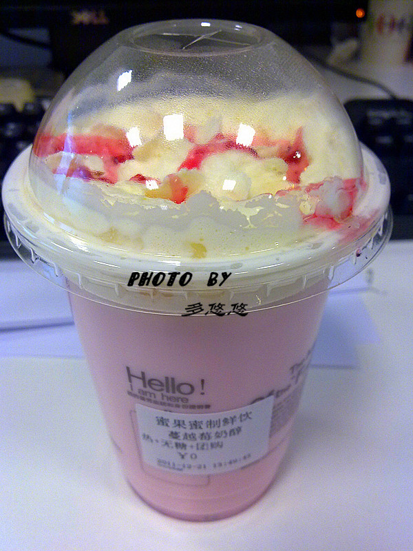 暖暖的,有果肉颗粒!香醇可口的奶茶上淋了厚厚的淡奶油,真心好喝!