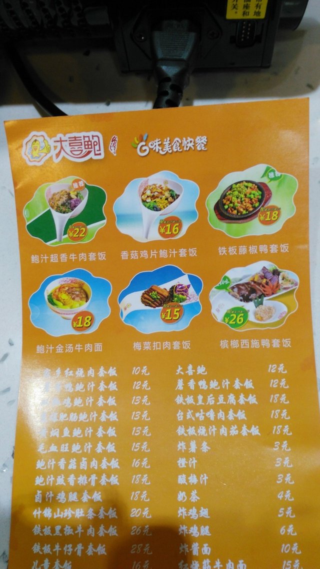 大喜鲍新派快餐--相当不错的快餐 曾经的郁金香等级42015-01-0912 浏览 关注 观音桥步行街盈嘉中心负1楼里 招牌上写的是台式鲍味G味前卫新派菜肴店.有套餐和面条,套餐种类比较多,而且都是配的鲍汁拌饭,听上去好高级哟,我点了一套毛血旺鲍汁套餐和一杯酸梅汁才18元.分量不错,鲍汁饭好吃,毛血旺一大碗,配了一份炒菜芯,比起重庆其他几家中式快餐厅,这里的菜品质量和味道都要好些.希望以后能推更多新菜品出来.以上食记乃用户个人意见 , 并不代表OpenRice之观点。赞好分享大喜鲍新派快餐--相当不错的快餐 大喜鲍新派快餐 https://s.openrice.com/KtLT200N6eE00检举 张贴 评分5味道5环境5服务5卫生5抵食用餐日期2015-01-09用餐途径堂食