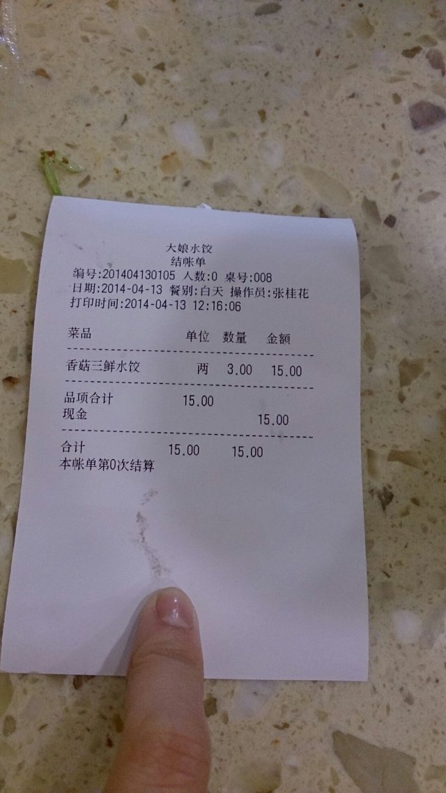 大娘水饺 张丽丽等级42014-04-2220 浏览 关注 大娘水饺,吃过几次,味道还不错。 他家的环境很干净,卫生,服务也算可以。自己去柜台买好,付账,然后服务员送到餐位上。 在每个桌子上,会有调料,辣椒,醋,都是自己放的。 这里水饺一两是6个,但是个头不是很大,一般三两就足够了,18个水饺。他家的饺子样子挺特别的,没有褶子,就是直接捏上的,馅料一般,不是特别多,但是也不是很少,味道属于比较清淡的。这里人均不贵,不到20元,就能吃的挺饱的。 以上食记乃用户个人意见 , 并不代表OpenRice之观点。赞好分享大娘水饺 大娘水饺 https://s.openrice.com/KtLT1m0PdOA00检举 张贴 评分4味道4环境4服务4卫生4抵食