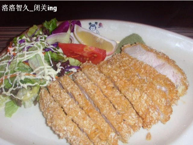 好大的一块猪排啊~~油炸的很通透~~猪排的色泽很诱人~~而且外层很酥脆,里面的肉质也很新鲜~~肉味偏淡,沾上些边上的绿色粉末(估计是椒盐粉之类的)就正好了~猪排边上还有一小份的蔬菜色拉,边吃猪排边吃些蔬菜色拉,很是爽口~
