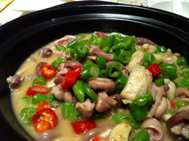 大肠煲,除去大肠不说,整个菜品的卖相还是非常不错的,尤其是黄色的浓郁的汤,使整个菜品看上很生动,加上红、绿辣椒的点缀,增添了菜品的色彩感。