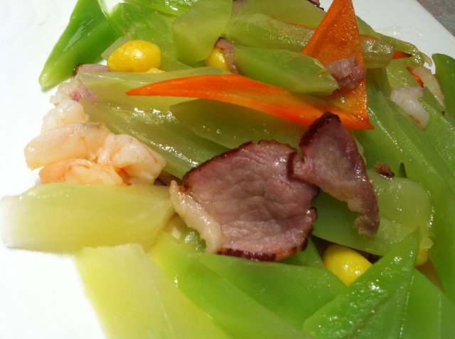 莴笋腊肉,除了莴笋和腊肉,还加入了虾仁和白果,白果的加入使整个菜品的健康价值提高不少,大鸭梨能有这样清淡的菜品,不易哈,量不是很大,但解油腻相当好使。