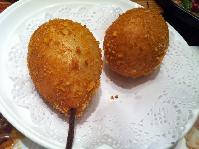 金鸭梨,大鸭梨的代表作品,非常好吃的甜品,也算是主食,主要成分是糕,加入了糖或者豆沙,外表很脆,我非常喜欢。