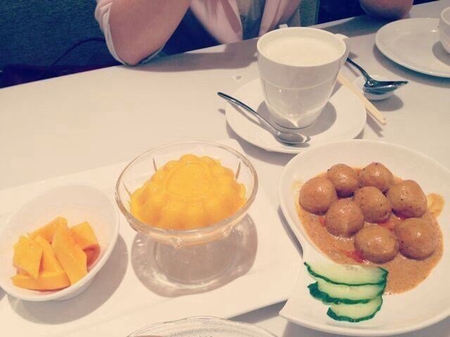 咖喱鱼蛋典型港式小吃,其实就是将鱼丸放在咖喱等各种香料熬成的酱汁煮熟,淋上甜辣酱。鱼蛋个头不小而且吃起来很劲道弹牙,鱼蛋裹着浓浓的咖喱汁,那种独特的味道和香味让喜欢咖喱的人吃起来无比的满足。布丁是芒果口味的,中间印着一枚桃心,不过加了几片芒果后身价暴涨啊,翻了一倍还多。唉唉,可是他家的布丁味道是真心不错呢,很滑很绵密,带着芒果浓浓的香味,味道也是微微甜,一点都不腻,口感和色泽上都很自然,个人觉得应该是用真的芒果做出来的,非常值得推荐。