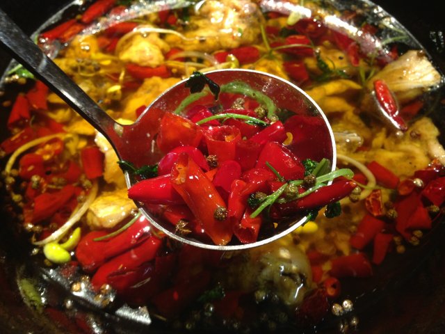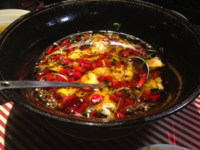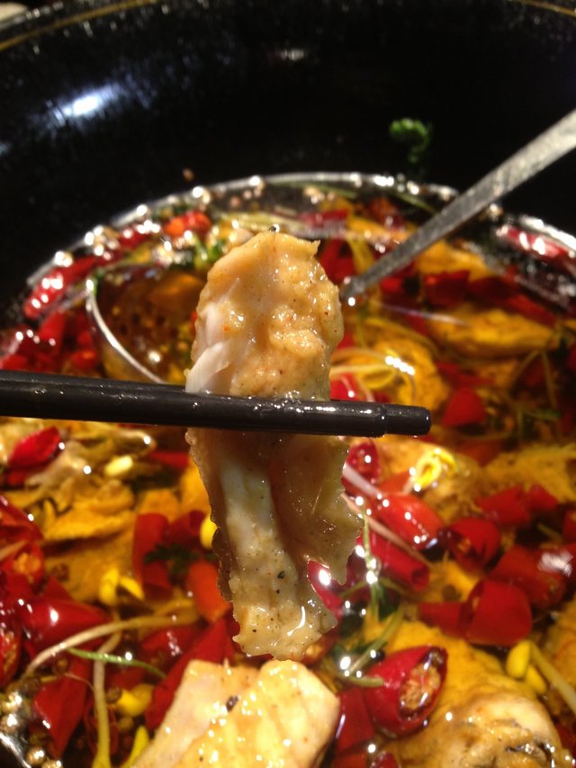 水煮鱼的油看着很清亮,鱼肉不少,只不过用的是草鱼,刺很多,但是鱼肉很入味,朋友说这是他吃过最好吃的水煮鱼。鱼肉事先都腌制过,所以特别入味,而且肉质很细腻,没有很辣,但是很麻,对这点我非常满意,但稍稍有些肥腻,豆芽菜不入味,这点比较糟糕,最爱吃水煮鱼里的豆芽,可是这个并不成功。