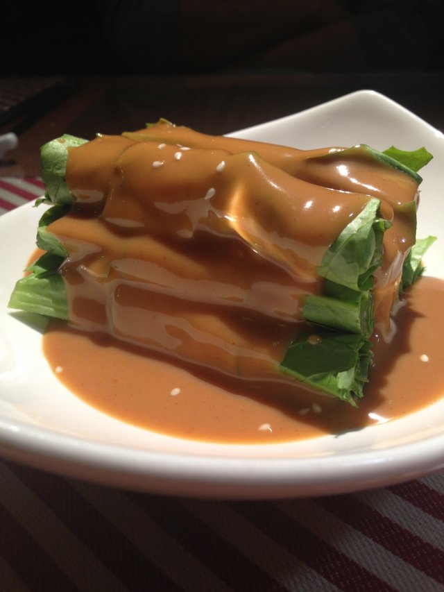麻酱油麦菜做得有模有样,上面淋的像是花生酱,厚厚的一层有点糊嘴,油麦菜中间用黄过片裹起来,黄瓜的清香中和了花生酱的甜腻,这样的搭配非常不错,算是创意料理了。