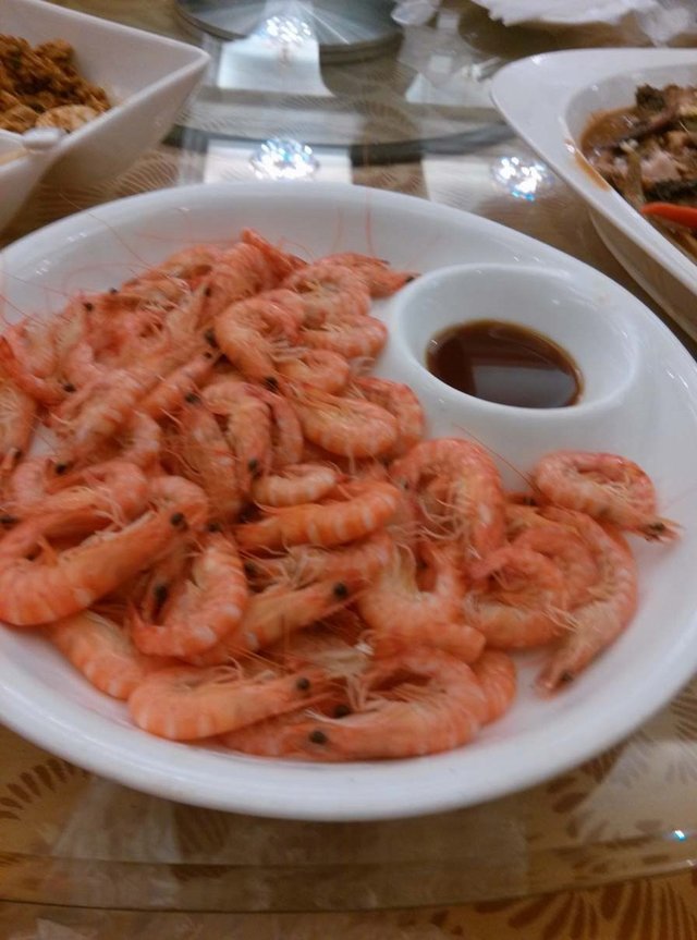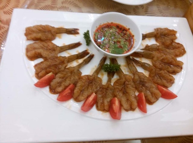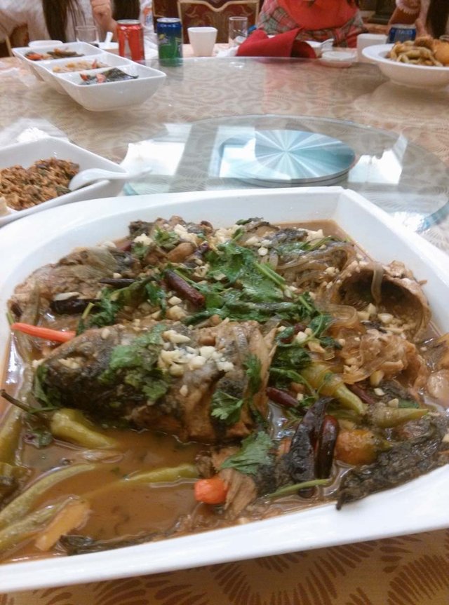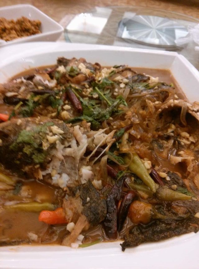 海鲜有4种,一个虾爬子,吃了一个太辣了,还被扎了一下,肉质比较紧实,算是挺肥的,虽然个头不大~~一个基围虾,又大有小,菜单里这道菜是150多还是170多来着,量还可以,虾的味道还是蛮鲜美的哦~一个生卤虾,这个是把生的虾去头去虾线,去壳只保留尾巴那里一点壳,然后裹上类似于酱油那种颜色的酱料,添了一下,因为生的没敢吃,味道怪怪的,也不便宜啊~水库炖鱼,这个是招牌菜,我觉得味道非常之一般,可能是因为是比较纯天然的食材+做饭所以才是招牌吧,不过没有腥味倒是真的