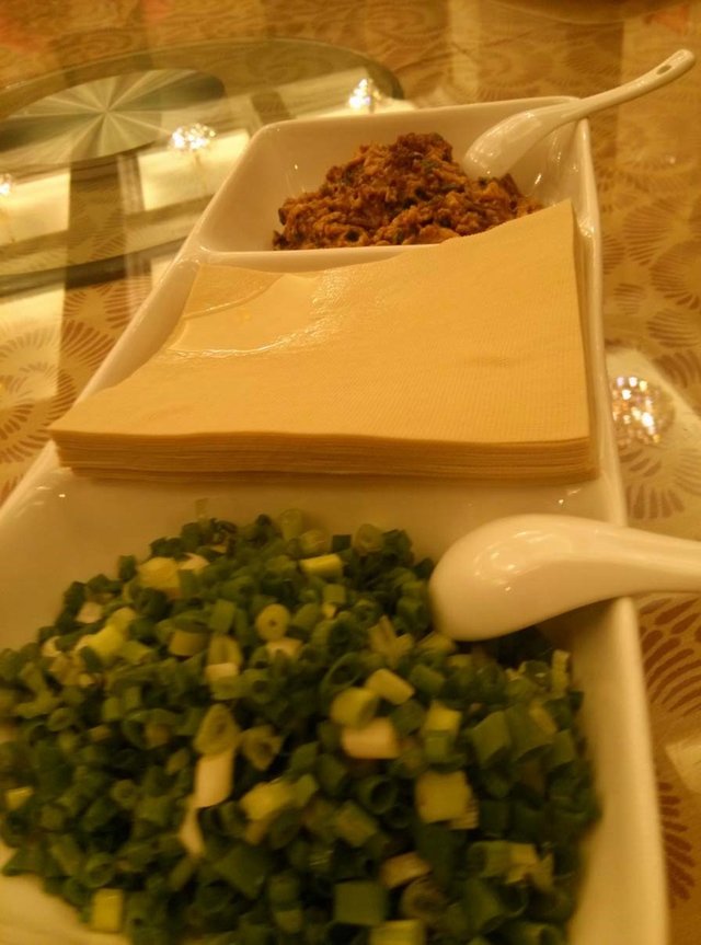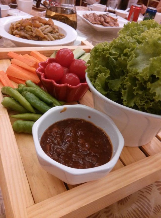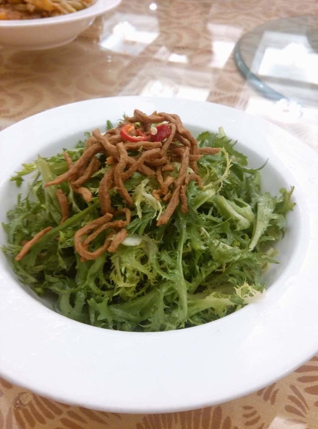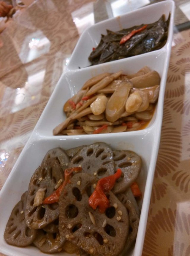 凉菜上了5种,一道蘸酱菜,包括胡萝卜条、黄瓜条,4个圣女果,味道还是不错,很新鲜;一个捞拌,无感,吃了之后一点印象都没有了;一个拌苦苣,有点酸;一个拌香芹,香芹很香哈;一个干豆腐葱花鸡蛋酱,是香葱,所有不辣的,这个就不多说了