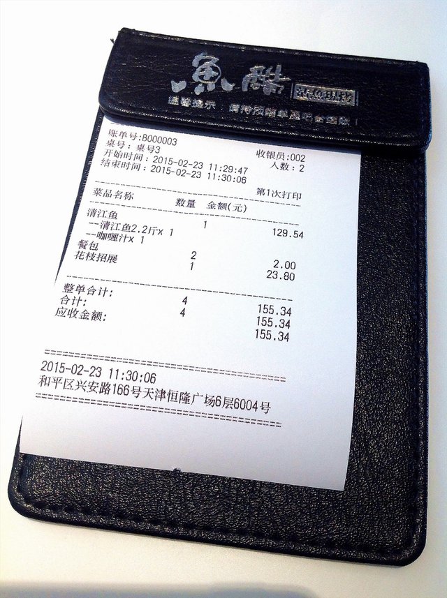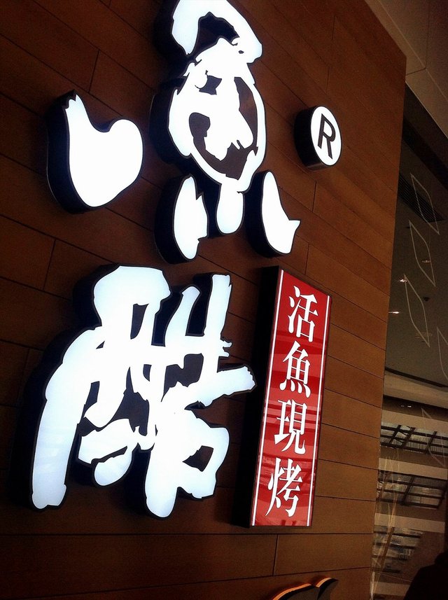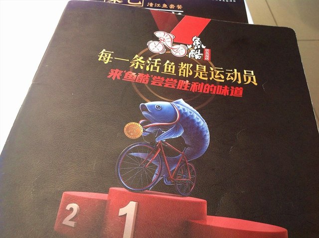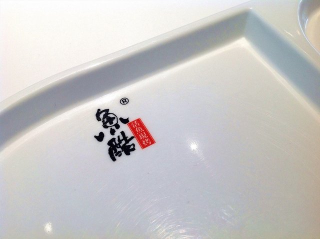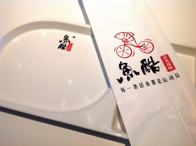 店铺的装修环境清新亮堂.靠窗的位置.阳光照进来很好,中间的位置吊顶都是实木的,都有顶灯.前面就是取烤好鱼的窗口,店内靠里和窗边都是二人的位置.中间是四人的位子,中午人太多.就没有照,座位都是蓝色的沙发座位.挺舒服的.桌上放有餐巾纸,餐具上印有logo,也把放鱼刺的位置分出来了.