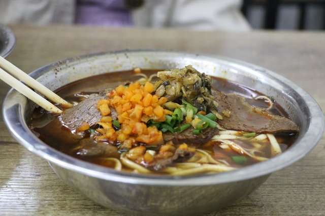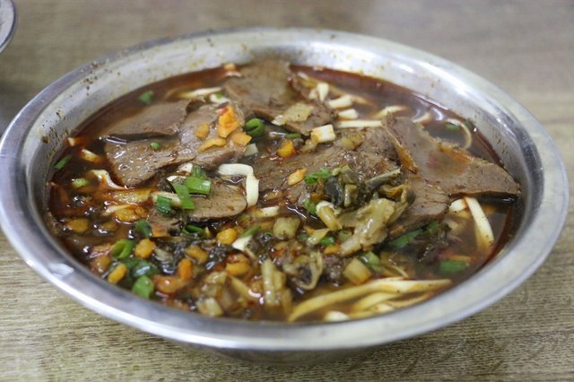 牛肉面的话,牛肉跟炒面的是一样的,面是宽扁的,比热干面那种有咬头。而且汤头很香很辣,吃起来很过瘾,还可以自己加点腌萝卜、酸豆角什么的,味道好赞,吃完后大汗淋漓。
