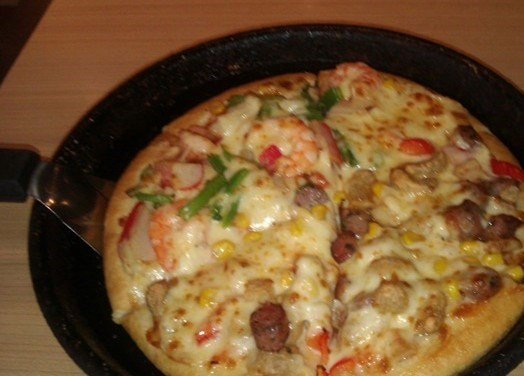 好吃的 cuiying_48等级42014-12-1411 浏览 关注 突然想吃披萨,于是就来到了这家位于崇文门新世界旁边的必胜客啦。进门有人招呼,嘻嘻,就一位,找个座坐下,还行上座率80,小哥儿都挺忙碌,环境优雅。 果断要了海陆至尊啊,嘻嘻,等餐的无聊间隙,拍了拍环境,刀叉。桌上有商务套餐,超值。披萨一如既往好吃的,拉丝的芝士,一半是大个的虾仁,蟹棒,一半是牛肉粒吧,和香肠。迅速干掉一大半,打包走人。嘻嘻 服务到位,口味不赖。以上食记乃用户个人意见 , 并不代表OpenRice之观点。赞好分享好吃的 必胜客欢乐餐厅 https://s.openrice.com/KtLT1m04FuD00检举 张贴 评分4味道4环境4服务4卫生4抵食用餐日期2014-12-01用餐途径堂食人均消费¥50 (午餐)
