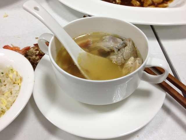 【老母鸡小排汤】这个汤是大补,完全犒劳工作辛苦的我们。汤汁顿得蛮久。鸡肉和小排的味道都在汤里了。就是炖久了的肉,就会很淡很柴。没有了滋味。这个时候只有汤是好喝的。肉如果没有配有蘸酱,实在是不想吃。汤我倒是盛了好几碗。