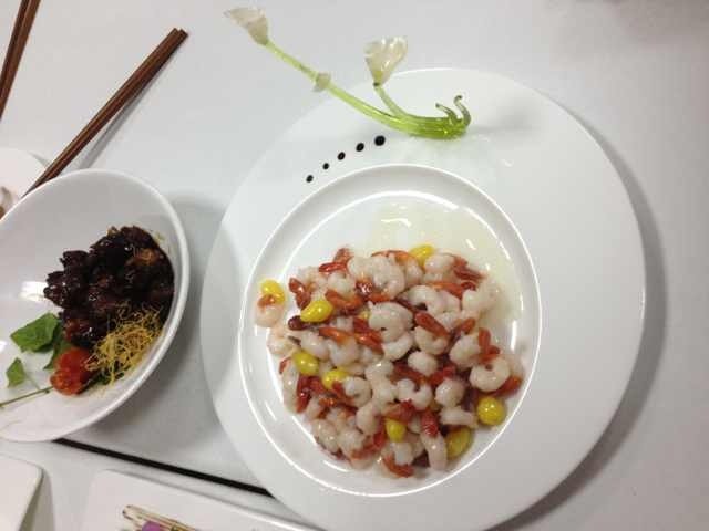 【清炒河虾仁】一看就是河虾仁,因为虾仁小小的。里面有松子,枸杞,看起来色泽非常好看。河虾仁里面还有龙井的香味。现在炒虾仁不是都流行用龙井么?虾仁小小的,一口一个正好。旁边配有蘸醋。不过我平时吃东西不蘸醋的。更加偏好原汁原味。虾仁本身口感清淡,透着河鲜的鲜美。好吃。