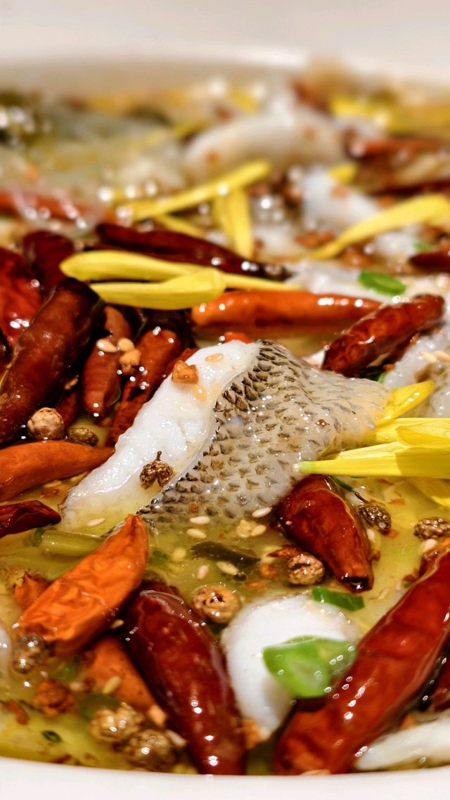 一上枱,真係嚇親!超大一盆,紅卜卜嘅辣椒乾🌶️、青bb嘅蔥花同埋黃色嘅菊花瓣🌸鋪滿晒成個面,色彩勁豐富,視覺效果一流,聞到陣陣酸辣香氣,口水已經開始流喇🤤。啲魚片望落去好似BB肌咁白雪雪、滑捋捋,而且份量十足,完全唔孤寒。