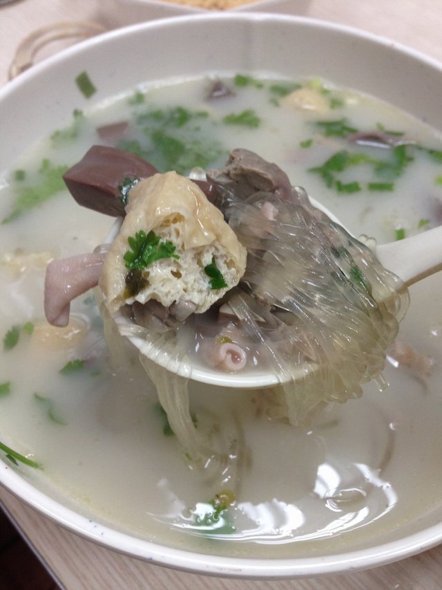 我尝试了一小块的鸭血,真的是嫩中带点儿韧劲儿,比果冻要好吃。粉丝也是大亮点哦。