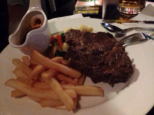 西冷牛排 这是比较中规中矩的,配菜呢有薯条,酱貌似是黑胡椒滴~