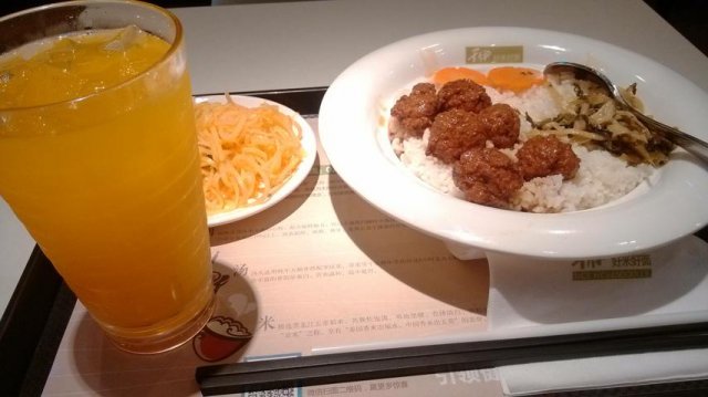 肉丸饭就是米饭上浇了几个肉丸子,然后加了一些配菜,个人感觉看着很好看,但是吃起来不咋地,配菜也是味道怪怪的,完全不适合我们的口味