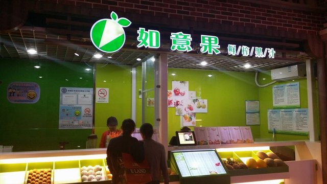 店门前摆放了各种各样的水果,让人看了就挺有喝的欲望。