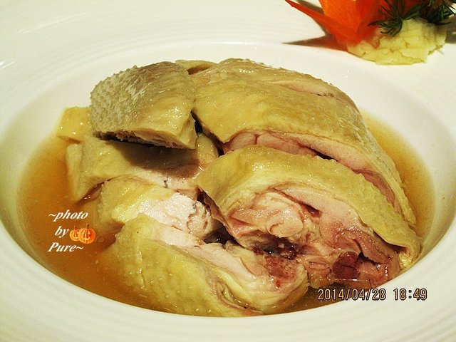 【醉鸡】直接拿盘装的。醉鸡金黄色泽的表皮呈现在大家面前的时候,我已经相当有食欲了。醉鸡没有过多的血丝,不咸反而很鲜。微微的酒味。鸡肉很嫩。鸡皮也脆脆的