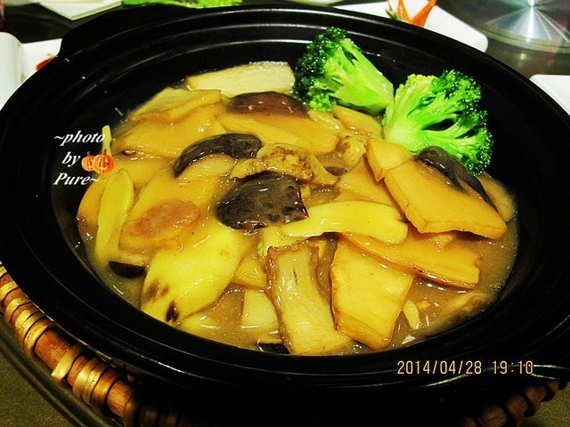 【一品菌王煲】就是菌菇煲,可是别提有多鲜美了。菌菇本来就很嫩很鲜。下面熬的浓成半凝固状的汤汁更加美味。拌扬州炒饭吃更好
