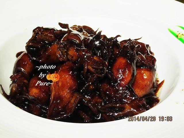 【酱烧仔乌】好惊喜的菜。你夹起一只乌贼放入口中,结果惊喜的发现里面竟然都是乌贼籽,那种一粒粒的口感融化在了嘴里,无比鲜美,无比惬意。一下子被惊喜到了。看起来烧的黑黑的。但是这种滋味,是地道的江南美味。