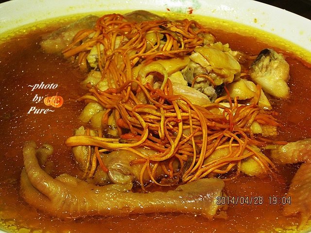 【蟲草花雞】摆盘就很震撼。无比抓人眼睛。一盆上来金黄金黄的鸡汤里浸润着鸡块,上面铺着各类菌类虫草。鸡肉的味道都已经被炖出来。滋味都在汤里。一勺金黄色泽的汤无比鲜美。里面的虫草,里面的菌类,里面的鸡,反而盖不过汤汁的风头