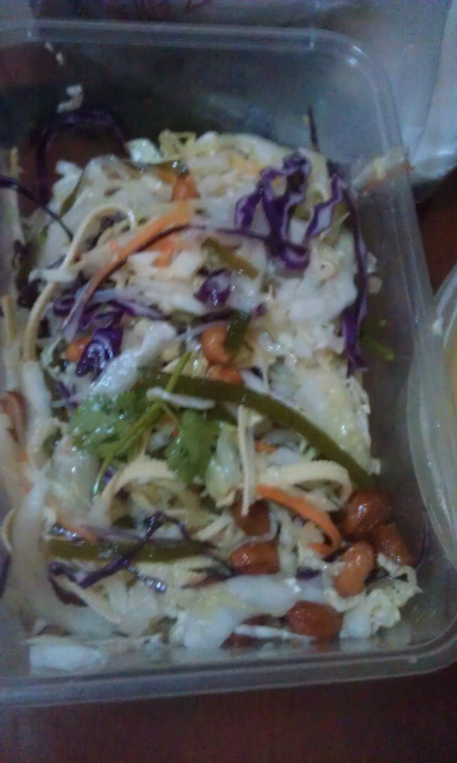 4、家常拌菜:14元一份,个人认为最好吃的一道凉菜,里面内容丰富:白菜丝,胡萝卜丝,海带丝,紫甘兰丝,花生仁,香菜等,味道是酸甜口味的,非常下饭,深受胃口不好的老婆大赞啊,而且蔬菜都非常新鲜,吃着爽脆极了,推荐噢。