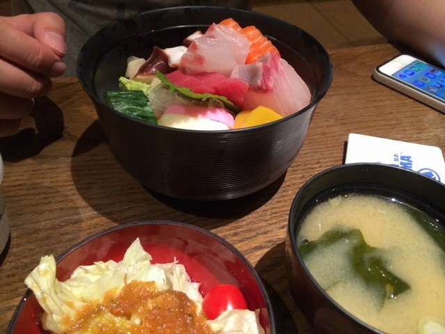 寿司饭套餐有分切成碎的小块的,也有切片的。生怕拿边角料来充数,请愿多加几块钱选切片的。刺身数量比我的三文鱼定食来的丰富些