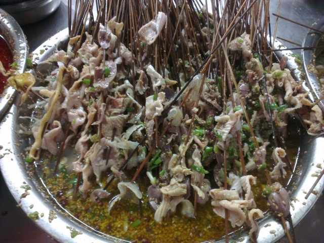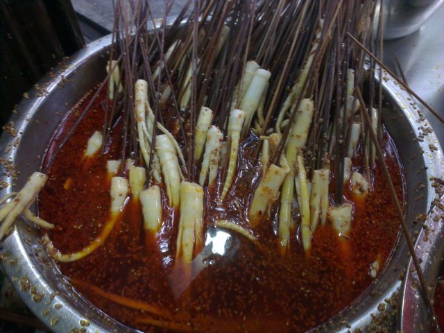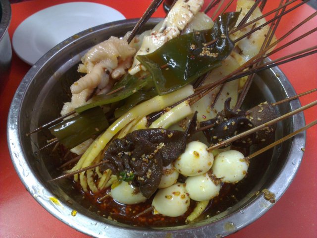 草堂北路这家钵钵鸡就是如此。 5点到店,基本已经快要客满。门口就放了好几个大钵钵。有素菜的荤菜的。自己拿小钵钵去挑选,丰俭由人。选好后再自己用勺子舀一些红油或者藤椒汤水进去。