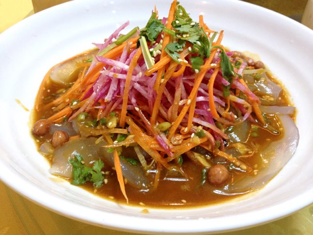 【东北大拉皮】18元,麻酱的味道很香浓,微微有点酸,好多的萝卜丝心里美萝卜和胡萝卜一堆的都不爱吃,还是里面黄瓜丝好些,拉皮很厚口感软软的,感觉韧一些会好吃些