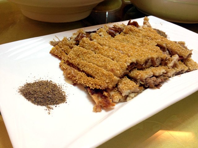 【芝麻鸭方】36元,鸭方的鸭肉还是很多的,但是比之前吃过的鸭方难吃好多。就是压碎的鸭肉做成了长条。长条厚厚薄薄的很不均匀,薄的脆一些芝麻味道弄一些好吃一些。鸭肉有点异味,口味很咸。配的小料更咸,咸的发苦,估计就直接把椒盐给倒了点来吧