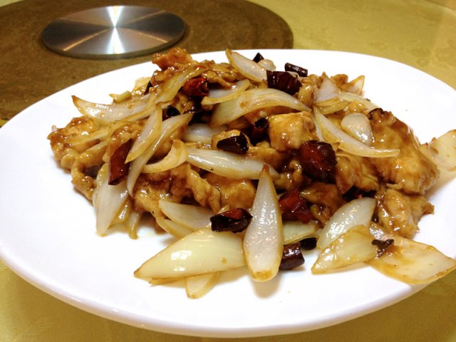 【贵州嫩鸡】25元,鸡肉切成了大薄片,用洋葱炒的,酸甜口十分的嫩,味道有点宫保的感觉,还挺好吃的
