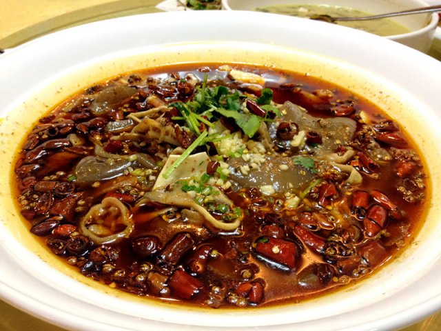 【毛血旺】48元,挺辣挺呛的,但是口味是偏淡的,里面的火腿和蘑菇啥的都没啥味儿。汤里找找还有肥肠,有点腥,血倒是不太多