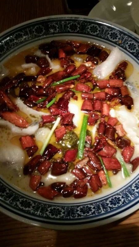 酸菜鱼看起来份量还行,刚端上来得时候上面铺满了干红椒,就得很辣啊。鱼肉半浮沉在辣汤里,用勺子一搅动下面的酸菜就浮出来,整个菜红红绿绿,白白的鱼肉看着满好看。鱼肉口感还是蛮嫩,也入味,酸菜的酸味很足,酸酸辣辣的蛮过瘾。