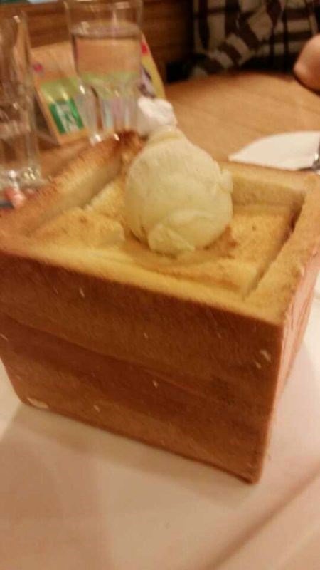 香草冰激凌土司,这个专为自己点的,本人对吐司的热情一直高温没褪过,特别是近两年推出的蜜糖吐司系列,总算把吐司摆上正席啦。很厚一个方形吐司,中间面包肉取出切成小块用黄油稍稍煎烤,让表皮变得焦脆奶香浓郁后重新放入吐司盒子里,最后放上一颗香草冰激凌。冰激凌顺滑奶味足,很甜蜜。吐司外脆里面柔软,面包皮很有韧性,吐司有点甜,口感很不错。