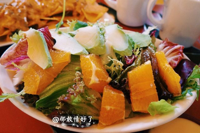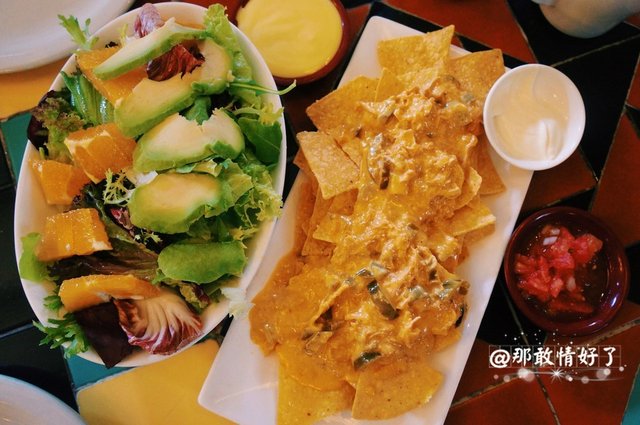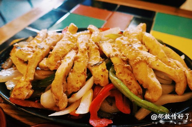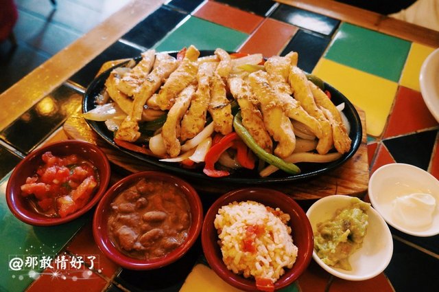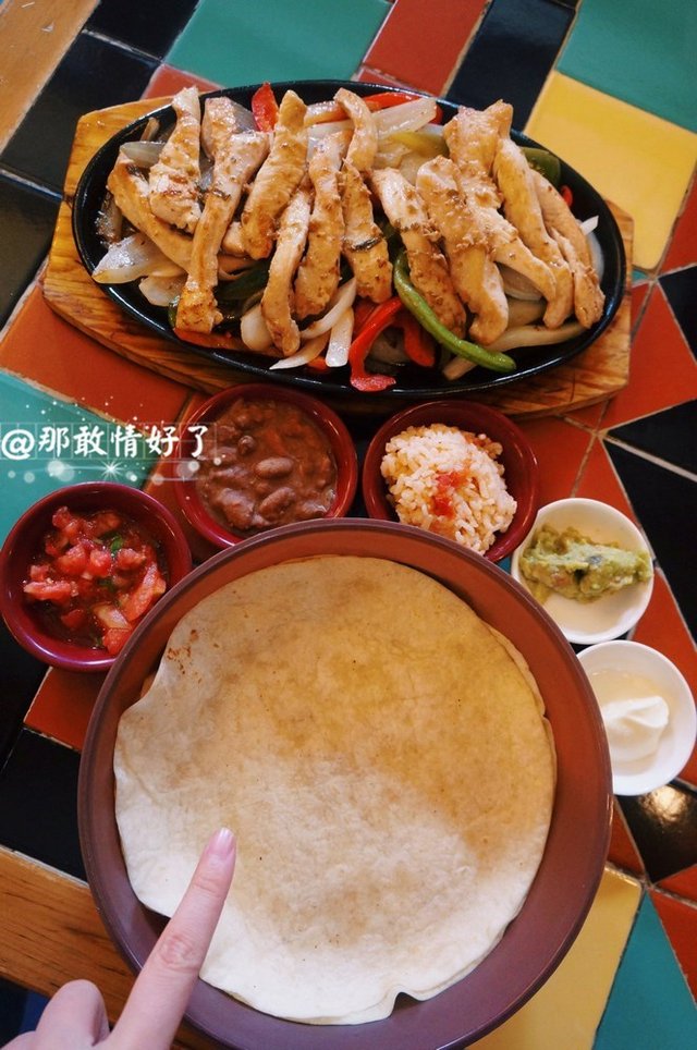 做墨西哥菜。鸡肉法嘿塔98,一份量足足的,几乎够我这种饭量的俩人吃,四张Taco饼,卷上鸡肉、葱头、彩椒,牛油果酱、红色的大个儿豆酱、居然还有米饭、西红柿酱,还有一种类似芝士酱的东西,挺好吃的嘿。