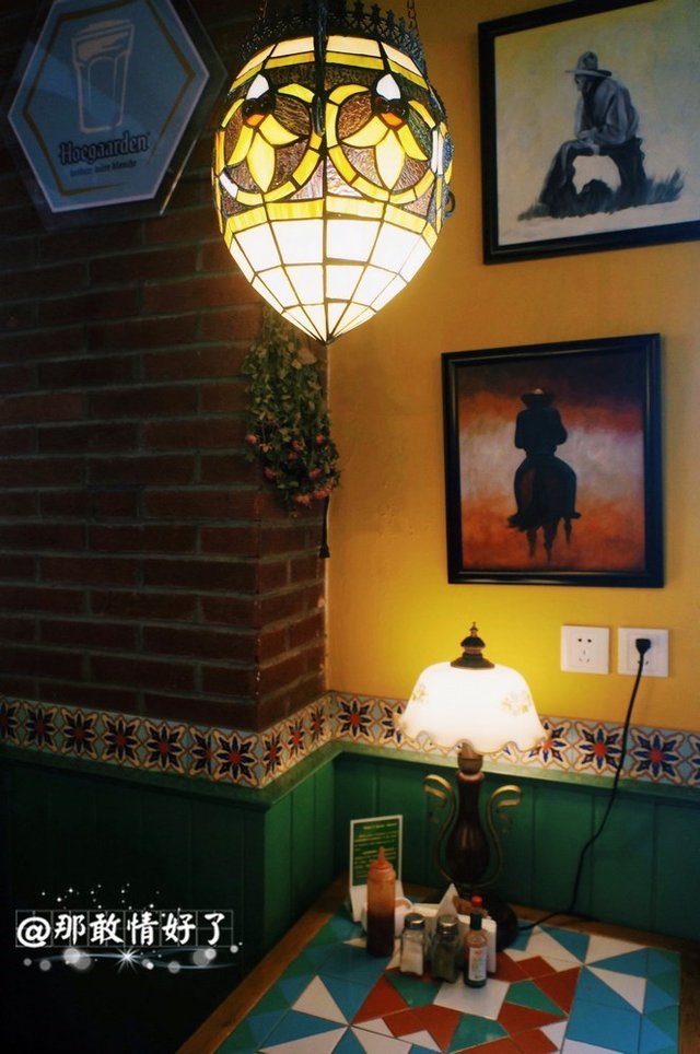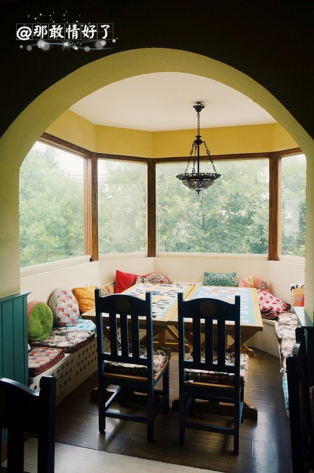 不起眼儿的门面路过都看不出来。门口有太阳伞的露天位,侧面有一排房檐下的景观位。一进门我就知道这家又拿住我了。艳丽色彩的装潢,摆设,格格布田园风光,而且带二层。面积很大,有大通桌可以办聚会,有整个阳台围坐的大桌。想必晚上来更好看。