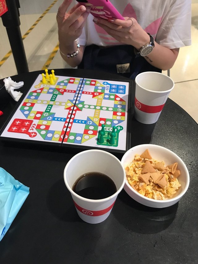 在等候的期間,小妹跟姐妹在玩飛行棋,而且店員會預備了飲料和小吃
